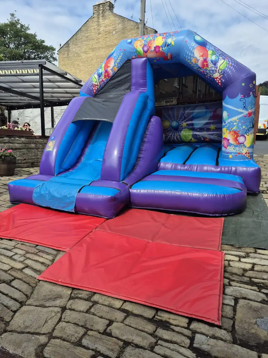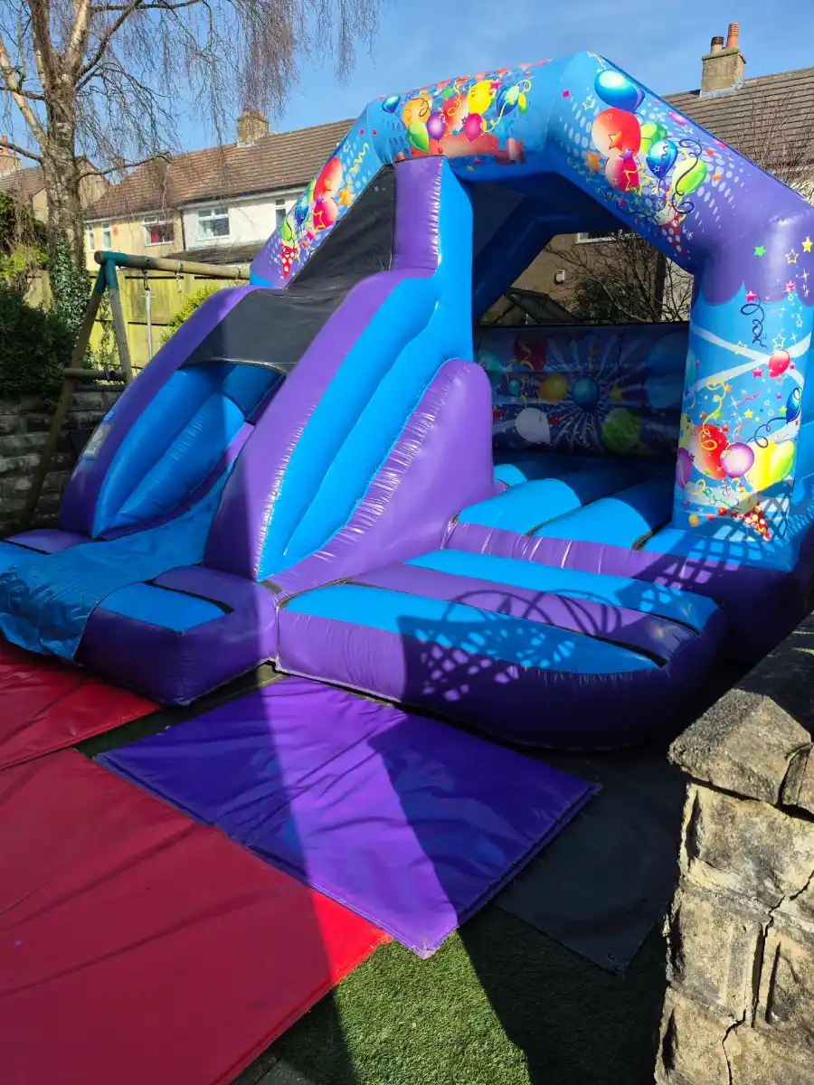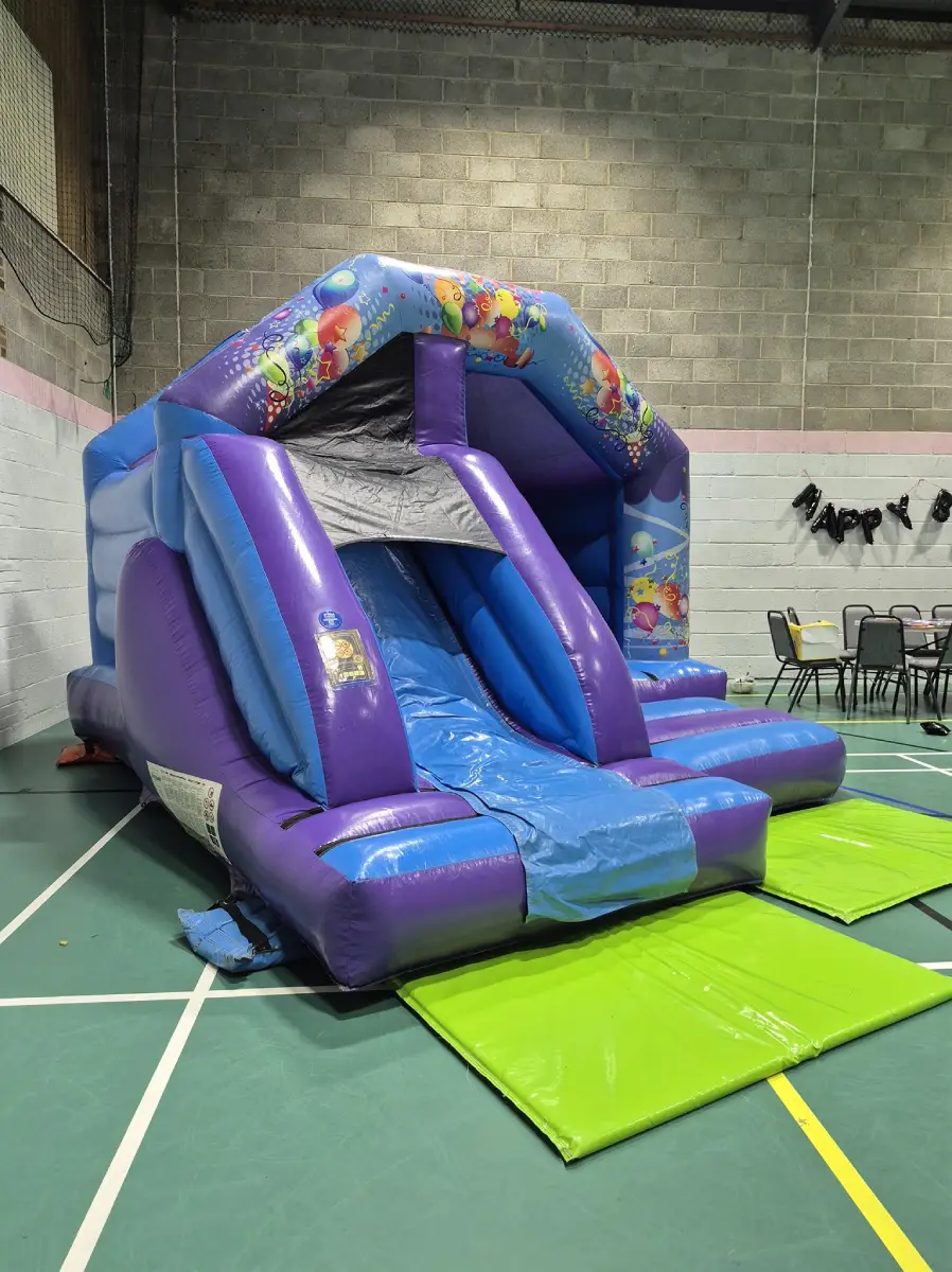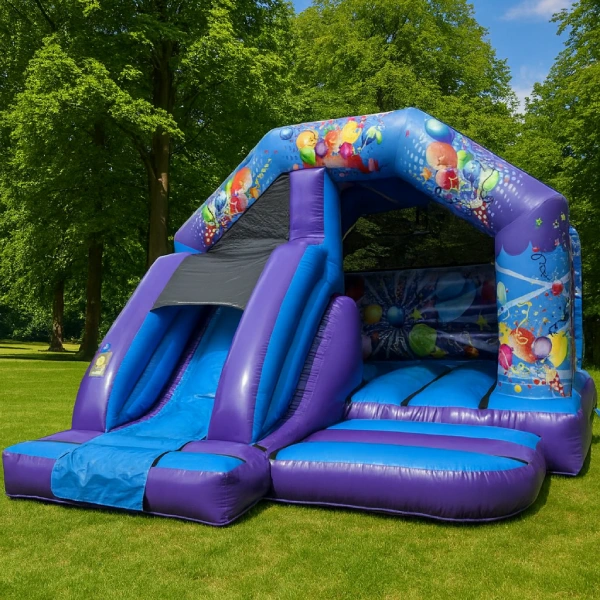 If you’re looking for a versatile inflatable that fits any occasion, the Blue & Purple Party Time combo is your go-to choice. Its striking deep purple and bright blue PVC, decorated with festive balloon and streamer graphics, makes it a fantastic centrepiece for any event.