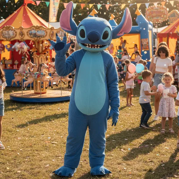 Are you wondering about the cost of a Stitch mascot costume? We provide affordable rates for all our Stitch mascot outfits for rent. For a truly special experience, explore our special packages featuring Stitch mascot suits for rent combined with our high-quality bouncy castles.